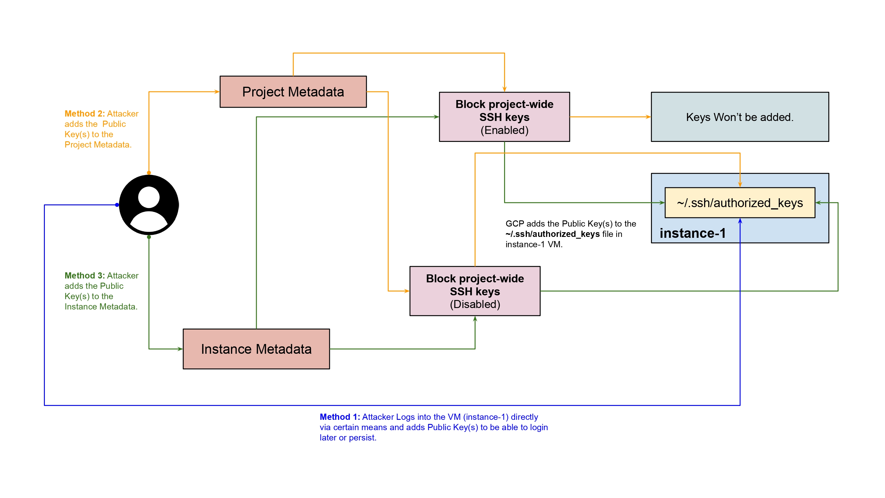 - Method 1: Attacker Logs into the VM (instance-1) directly via certain means, creates .ssh/authorized_keys file in HOME dir. and adds Public Key(s) to be able to login / persist.